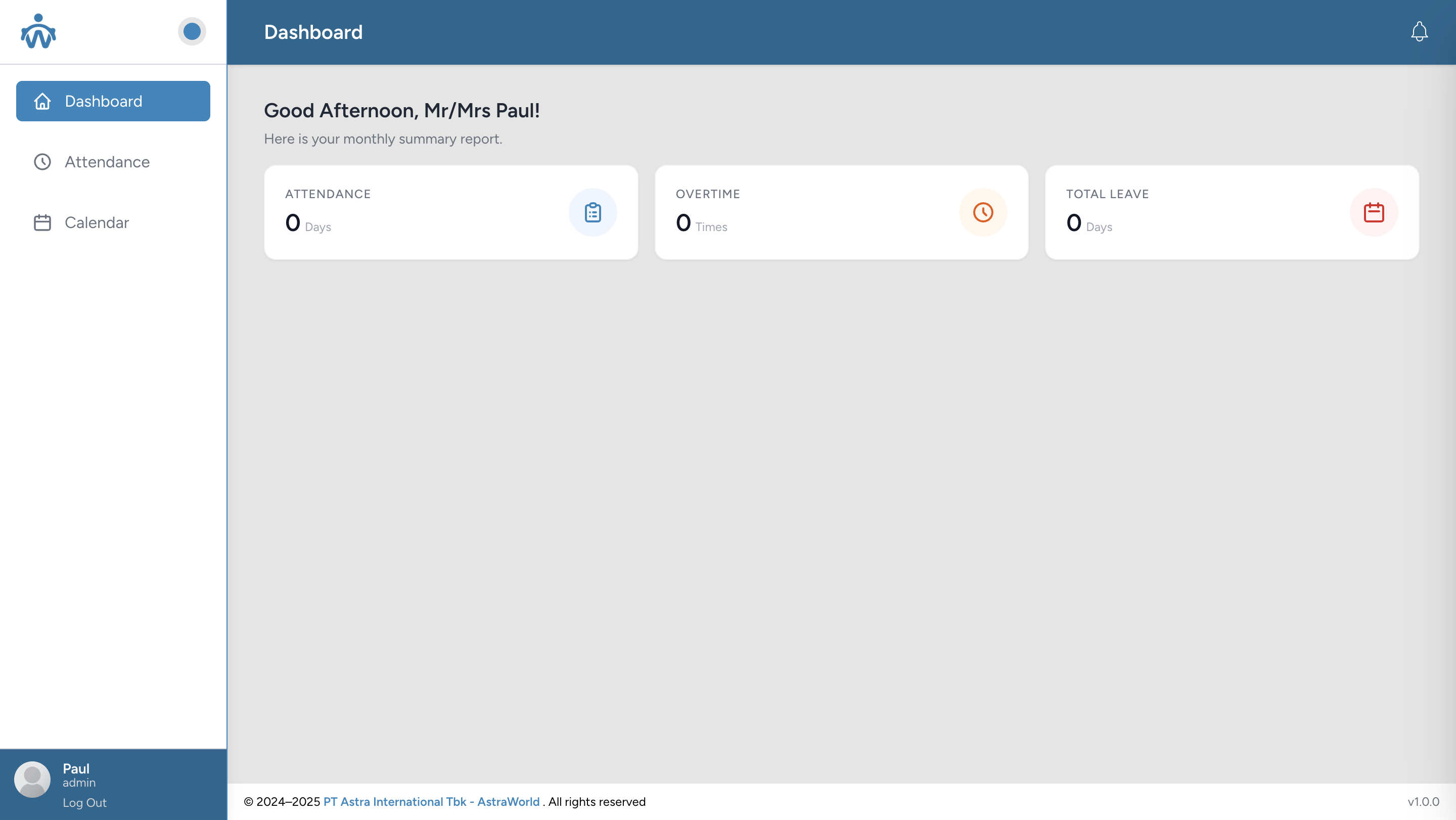 Employee attendance system for outsourced staff featuring a monitoring dashboard, daily attendance check-in, and a calendar to track attendance history and manage leave requests.
